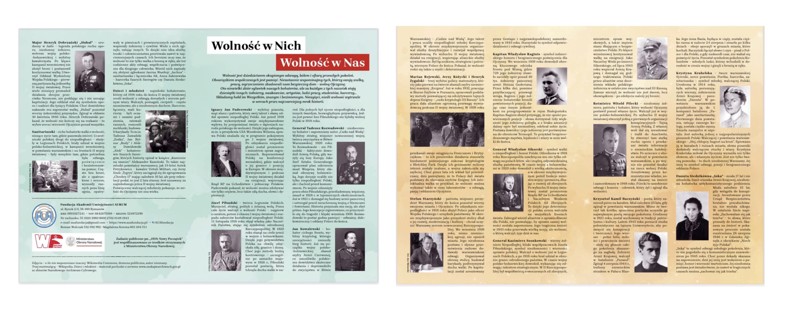 Fundacja AUA, w ramach realizacji projektu „1918: Nowy Początek”, przygotowała ulotkę edukacyjną pt. „Wolność w Nich, Wolność w Nas”. Publikacja ta przedstawia sylwetki osób, które w wyjątkowy sposób wpisały się w historię Polski i przyczyniły się do odzyskania niepodległości oraz budowania naszej tożsamości narodowej.