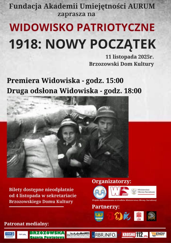 Fundacja Akademii Umiejętności AURUM z ogromną dumą prezentuje artykuł poświęcony wyjątkowemu widowisku patriotycznemu „1918: Nowy Początek”, które odbyło się 11 listopada 2025 roku w Brzozowskim Domu Kultury. Wydarzenie stanowiło artystyczną i edukacyjną refleksję nad odzyskaniem przez Polskę niepodległości oraz nad znaczeniem wolności we współczesnym świecie.