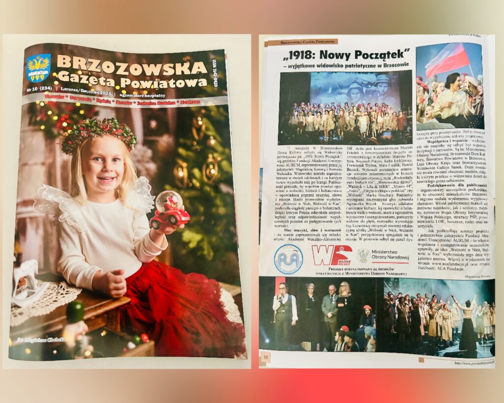 Artykuł zapowiadający realizację przez Fundację Akademii Umiejętności AURUM projektu pn. „1918: Nowy Początek”, współfinansowanego ze środków otrzymanych z Ministerstwa Obrony Narodowej, zamieszczony w Brzozowskiej Gazecie Powiatowej, Nr 7 (231), Lipiec/ Sierpień 2025, str. 36.